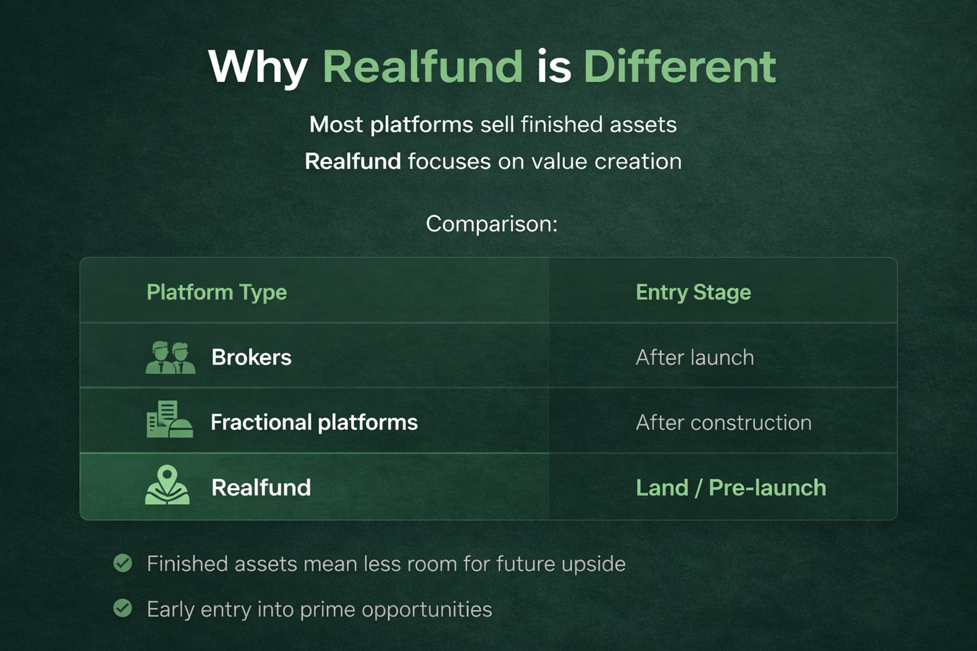 Real Fund provides Early stage projects , Fractional Investments, Land Acquisition and Pre-Launch Deals with a focus on wealth creation and portfolio diversification.